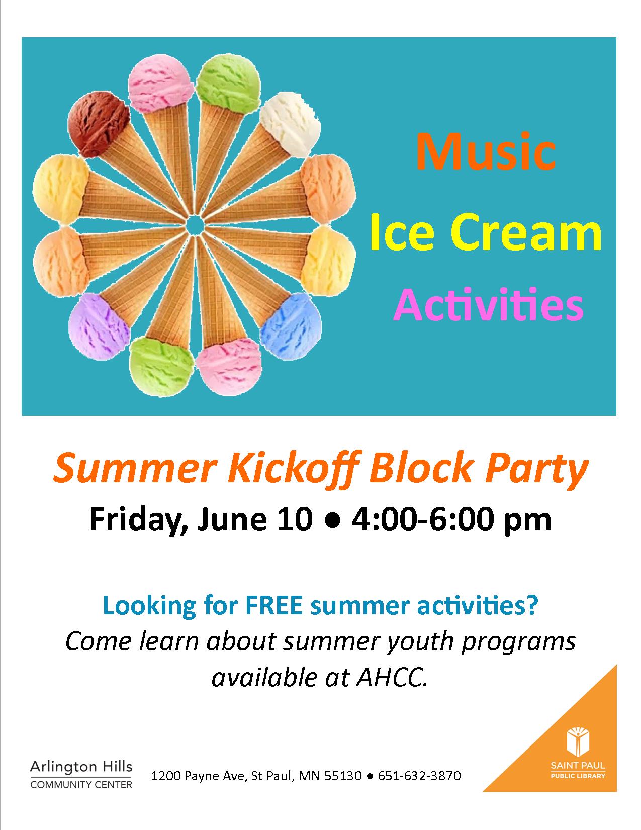 Looking for free summer youth programs? See what is available at the Arlington Hills Community Center this summer. Join us for ice cream and live DJ music. Friday, June 10, 4:00-6:00 pm. Call 661-632-3870 for more information.